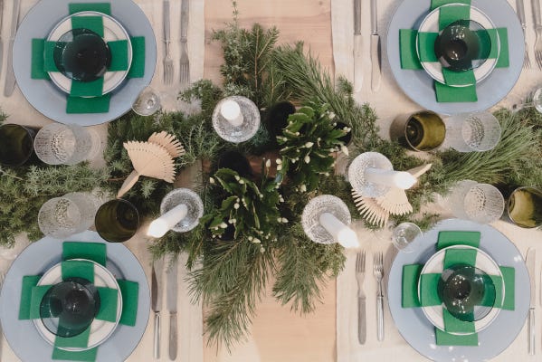 Luonnon raikasta tuoksua toistavat havut, katajat, männyt ja kuusenoksat muodostavat massiivipuupöydälle tunnelmallisen maton, jota kynttilät ja iki-ihanat joulukaktukset täydentävät. Turun Linnanfältin kotikorttelin tunnelmaan sopien kattauksessa sidotaan kauniilla tavalla yhteen uutta sekä vanhaa.
