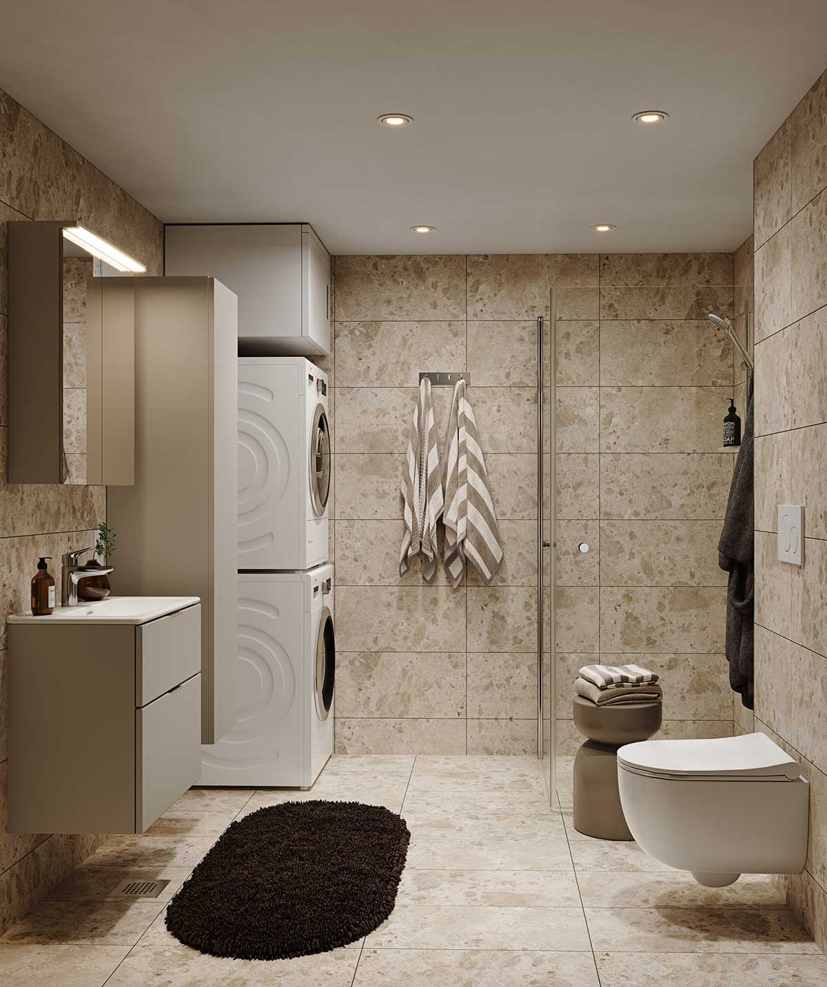 Valitusta tyylistä riippumatta kaikissa kylpyhuoneissa on mukavuuslattialämmitys, tilavaraus pesukoneelle tai -tornille sekä tyylikäs kirkaslasinen suihkunurkkaus tai suihkuseinä. Tunnelman viimeistelee kattoon upotettu led-valaistus. Jos haluat, voit lisätä kylpyhuoneeseesi enemmän säilytystilaa sisältäviä kalusteita, modernin pesukoneen tai –tornin tai turvaa tuovat tukikahvat.